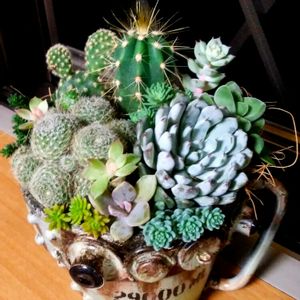 フラリエでお迎えした憧れのnikonomaさんのスチパン鉢✨ この前のお休みに寄せ植えしました💞 トーザラゴーサをメイン?に いや、サボテンがメイン?(笑) カッコいい鉢にど~したらいいか悩みながら、群生しているダイソー産サボちゃん、柱サボテン、バニーカクタスを寄せてみました🌵 いい味を出してくれたかな?