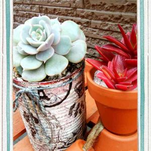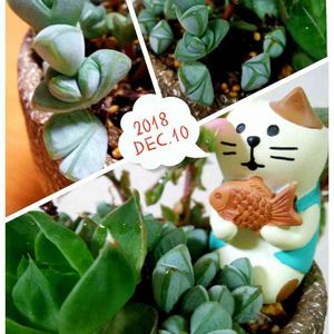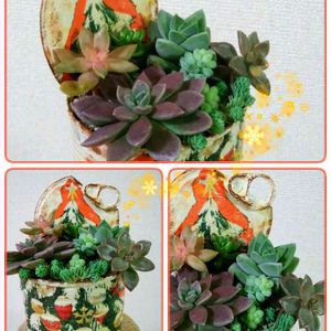 エコフェスタの戦利品✨ 最後の多肉さんはクリスマス寄せ植え🎄 緑鉢にカリビアンブルーとsuperboom×setosaを寄せました💞 サンタさんリメ缶には メキシカンスノーボールをお一人様に✨ 久しぶりにリメ缶を作りましたが…クリスマス柄のペーパーナフキンのおかげでなんとか形になりました💦思ってた色にならなかった~(^◇^;)ムズカシイナ…🍀 コポたん、クリスマス待ちきれずにつまみ食い~🐸クリームお口についてるよ~( ´艸`)💕