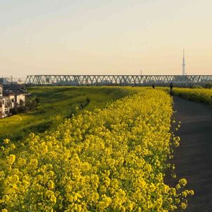 帰り道です〜 少し遠回りして土手からスカイツリーを望む… 菜の花が土手一面に咲いています〜🌼🌼🌼