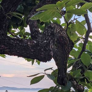 今の柿の木…普通ではありません😢 柿の実もあまり成らず、まるで枯れたような葉っぱの姿😱 病気でしょうか…? この柿の木のとなりの木には、コナジラミが発生していました😖 大きすぎて、手入れの仕方もわからない💦 柿の木のこと詳しい方、いらっしゃいますでしょうか?┏○ 一つ気になることは、雪害で折れかけ、土にくっついていた枝を、そのままにしていたことです😓😭