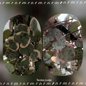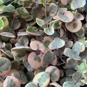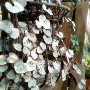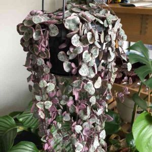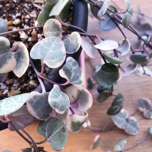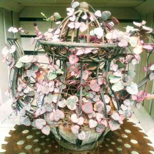 セロベキアとも言うハートカズラ💚 我が家のは斑入りのハートカズラです。 葉の裏側が💗💜になって、それもまたいい感じです。 ハート型の葉がたくさん連なる姿から 別名「ラブチェーン」とも呼ばれているそう。恋が実る植物とも言われているらしいですよ💕 。:+((*´艸`))+:。 ふふふ