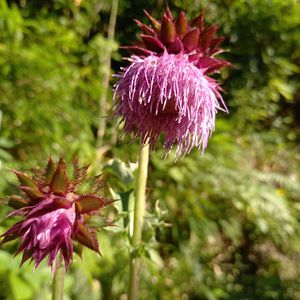 赤紫色のフジアザミの花が素敵です💗💜🌿 フジアザミは日本固有種でアザミでは最大級です。 大きい花は10cm位もあります。 富士山🗻周辺に沢山咲くのでこの名前が付けられました。 赤花と白花があります。 キク科 アザミ属
