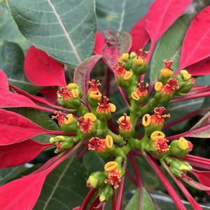 「ショウジョウボク」猩々木 ポインセチア 原産地 メキシコ 原種 ※ユーフォルビア・プルケリマ ※開花が進み小さな雌花の花柱も識 別できます(花弁はありません) 京都府立植物園温室2025/12/7 ポインセチア展開催中でしたー