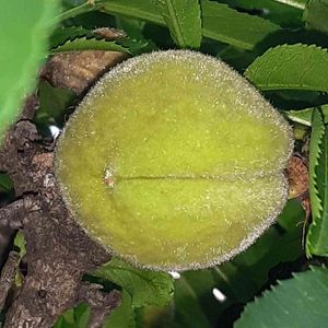 桃。 サイズは大きい梅の実ぐらい。 盆栽用の桃の花を地植えしたら実がゴロゴロなるようになってしまった。 でも樹高40センチくらいなので実を撮るのは大変。土から15cmくらいの所に生っている。