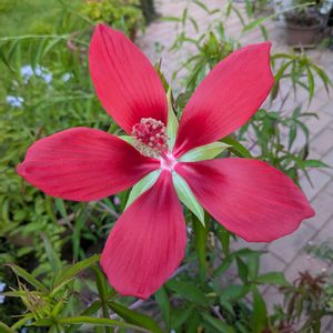 今日の庭〜🌺 ①モミジアオイ 1輪目が咲きました❤ ②③ヒメイワダレソウ 芝生に蔓延っています😅 ④センコウハナビ(ヒガンバナ科) 神代植物園温室にて📷️