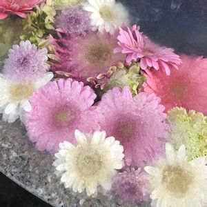 💐フラワーアレンジ💐 更新しました🏃♀️ 1日に制作したアレンジから傷んだ花材を取り除き スーパーの花束¥398で再制作 雪柳とフェザーでフワフワのアウトライン ストックとスイートピーのパープル スプレーカーネーションのピンク ガーベラ長もち 白山さまの花手水は桜に🌸