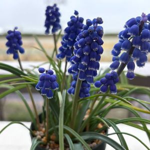 💙💜🩵ムスカリ 咲き揃いました✨ ①ムスカリ 一昨年のフラワーデザイン教室で使った花つき球根 増えました💕 ②プシュキニア 咲き進むにつれおじぎします⤵️ ③ブルージュエリー💎 ベランダで冬越し→元気に咲き続けてます ④ミニシクラメン 赤玉土×素焼鉢で育てたら花は小さくなりました💦 ミニミニシクラメン💦 ⑤白い椿 丸くてぽってり、可愛い椿見つけた💡