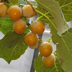 マメガキ(豆柿)カキノキ科カキノキ属 別名は小柿。東北アジア原産 河口湖畔の公園になってました。 昨年10月16日 直径1〜2cmくらいです。 秋に黄色に熟し、霜にあたると黒紫色になって甘みが増し、おいしいようです。 花期は6月頃。