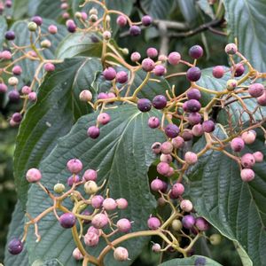 ミズキ ミズキ科ミズキ属 落葉高木 北海道〜九州に分布 山地にふつうに生える。 高さは10〜20m 枝を大きく横に張り出し、独特の樹形になる。 葉は互生し、広卵形または楕円形で縁は全縁で、大きな波状になり、葉先は尖っている。裏面はやや白色を帯び有毛である。 花期5〜6月 枝先に散房花序を出し、白い小さな花をたくさん付ける。(①) 果期8〜10月 始めは緑色から、肌色、紫色になり、紺色、黒く熟す。 ①花は5/1 三ツ堀里山自然園にて ①緑色の実は5/20 三ツ堀里山自然園にて ②肌色、紫色の実は8/30 散歩コースにて ③肌色、紫色、紺色の実になっている。 9/9 茨城県自然博物館の野外にて ④カラフルな実になる。 9/23 三ツ堀里山自然園にて ⑤9/23と同じ実を観察。少し色が濃くなっている。周りの実は黒くなってしぼんでいるものもあった。 10/2 三ツ堀里山自然園にて この実は果柄が赤くなるのでよく目立つらしい。 鳥の餌やツキノワグマの好物で冬眠前の大切な食料となる。 🏷️木曜日は木 🏷️木曜日は木の実 に参加させていただきます。