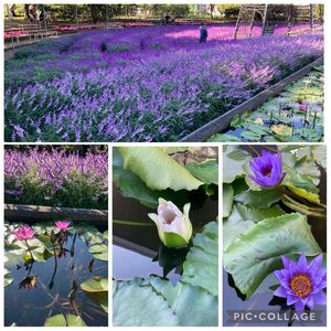 あしかがフラワーパークにて 入り口付近はアメジストセージがいっぱいで、どっちをみても紫のジュータンのようで綺麗でした😊😊😊その周りにはスイレンが咲き始めていて、これからが見頃かなぁという感じでした💜💟💜💟💜