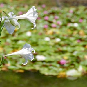 『📢おーい❗️そこのピンクのグループ❗️ 近いよ! 密になってるよ‼️』 と言う声が聞こえてきそうな「テッポウユリ」が、「睡蓮」に向かって咲いていました✨😄