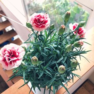 外の駐車場にあったカーネーション、花が綺麗なので、ダイニング脇へ移動。ツボミがたくさんついていて、お世話しがいがありそう。