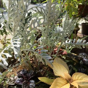 我家のシロタエギク ダスティーミラーでしょうか?一年でとても大きくなりすぎました。挿し穂にして小さなポット苗を作りたいけど、いつ頃切ればよかったのでしょうか?花は見たことないんです。もしかしたら花の時期に剪定していたのかもしれません。 手前のキャラメル色のリーフはコリウスでしたか? シロタエギクの奥のほうに銅葉のプリムラがまだ残っています。夏を越すことができるかどうかな😃