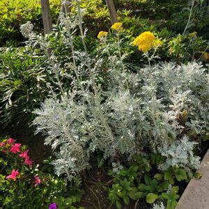 『シロタエギク』 花は咲かせないで寄せ植えのためのカラーリーフでしたね🙀 知らずに地植えしたらめちゃ大きくてビックリしてしまいました😸 花言葉には、「あなたを支える」や「穏やか」といった意味が込められているそうです🌸