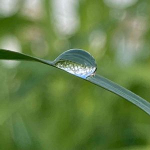 朝露に写る世界💧 今朝の散歩での出会い✨ 空も写ってます。 もう秋の虫の音も聞こえてました♬