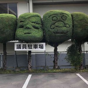 3日に一度通る市役所庁舎前にある議員さんの🅿️。 今朝初めて気づいたので、多分この数日で刈り込まれたものだと思うのですが、、、。 いかがです?ユニークな刈り込み。 こんな街に住んでおりまーす。