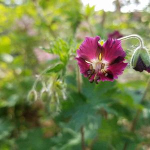 黒花フウロ、とっても強い子です❗ 寄せ植えたまま放っておかれること、数ヵ月… (っω<`。)ゴメンヨ…💧 生きて芽吹いていました🌱 単鉢に移したら、間もなく蕾が。 ピックにくっついてるのは🐞の子供かな(•̀ㅁ•́ฅ)ヨッ