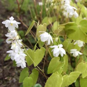 3月27日撮影 瑞穂町 耕心館 通用門の近くに小さな花が…。ヒメウズ!?と思って寄ってみると、形が違います。札は付いていなかったのですが 調べてみると バイカイカリソウ?イカリソウの仲間ではないですか? バイカイカリソウ メギ科イカリソウ属 (イカリソウはメギ科ですが、その上はキンポウゲ目です) 地下茎は褐色で塊状、質は硬く、硬いひげ根を多数出す。茎の高さは20-30cmになる。葉は、1-2回2出複葉で葉柄が長く、小葉は長さ2.5-5cm、幅2-3.5cm、ゆがんだ卵状から卵状楕円形で、先端は鈍頭、基部は心形でやや斜形、縁は刺状の毛が無いか、あっても基部の耳部だけに少しあり、小葉に小葉柄がある。葉の裏面には開出する細毛があるが少ない。 花期は4-5月頃。茎先に総状花序を出し、やや下垂して径10-12mmの白色の花を数個つける。萼片は内外2列で8個あるが、外側の4個の外萼片は膜質、小型で早く落ち、4個の内萼片は卵状披針形で花弁状になり、花弁と同じ長さになる。花弁は4個あり、倒卵形で先端は鈍形で長さ6mm、基部にはイカリソウ属の特徴である碇状の距がなく、蜜腺がない。雄蕊は4個、雌蕊は1個ある。 (Wikipedia より)