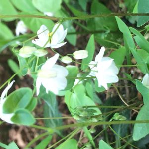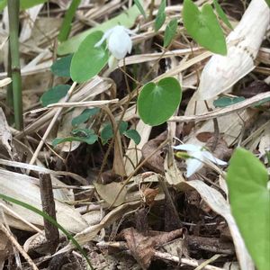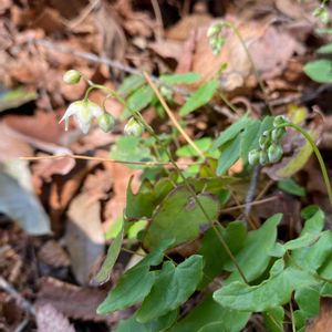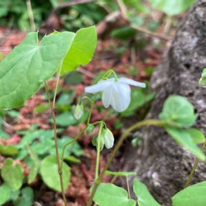 梅花碇草(バイカイカリソウ) メギ科イカリソウ属の多年草。山地の林内に生える。高さ20~30㎝。根生葉は1~2回2出複葉。小葉は左右非対称のゆがんだ卵形で、先は尖らずふちの刺毛はないかあっても少なく、裏面の毛も少ない。花期は4~5月。花は白色で梅の花に似ている。下向きに咲き、直径1㎝ほどと小さい。真ん中の4片が花弁、周辺の4萼片は花弁状。碇草(イカリソウ)は花弁の距(きょ💬花弁や萼の一部が管状に突出したもの)が長く伸びているのが特徴だが、本種にはこの距がない。 イカリソウは、4つある花弁が細長い筒状で先が尖る。この形が船の碇(いかり)に似ることからついた名前。本種はさらに梅の花に似ることから梅花がついた。 出典『山に咲く花』『四季の野の花図鑑』『春の野草』