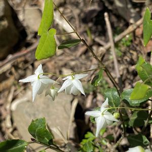 梅花碇草(バイカイカリソウ) メギ科イカリソウ属の常緑多年草。山地の林内に生える。高さ20~30㎝。根生葉は1~2回2出複葉。小葉は左右非対称のゆがんだ卵形で、先は尖らずふちの刺毛はないかあっても少なく、裏面の毛も少ない。花期は4~5 月。花は白色で梅の花に似ている。下向きに咲き、直径1㎝ほどと小さい。真ん中の4片が花弁、周辺の4萼片は花弁状。碇草(イカリソウ)は花弁の距(きょ💬花弁や萼の一部が管状に突出したもの)が長く伸びているのが特徴だが、本種にはこの距がない。 イカリソウは、4つある花弁が細長い筒状で先が尖る。この形が船の碇(いかり)に似ることが名前の由来。本種はさらに梅の花に似ることから梅花がついた。 出典『山に咲く花』『四季の野の花図鑑』『春の野草』