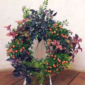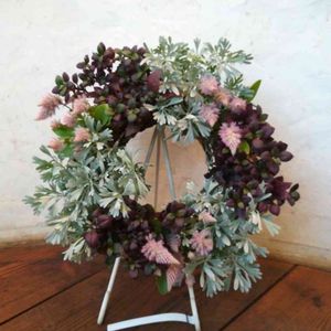 華やかな色合いのリング寄せ植えです。 アドベントクランツ風にアイアンスタンドに飾ってみました。