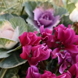 陽が陰りそうになり、 慌てて庭仕事💦 ①ガーデンシクラメン 葉牡丹の季節ですね〜 ②カメムシ被害多発の薔薇さん いゃだ〜(ᗒᗩᗕ) カメムシ!花びらの間から出てきてる💦