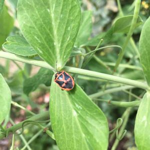 カメムシの一種、ナガメだって。私の大事なスナップエンドウちゃんに何してくれんの!と思ったら、アブラナ科の植物の汁を吸うんだって。ナバナの方だったみたい。カメムシって、草食系と肉食系があるそうで、多分皆さんも一度は見たことがあるサシガメが肉食代表。友達曰く、蜂に刺されるぐらいの痛さだってヨ、コワ(o_o)でも、イモムシとか取ってくれるから益虫でもあるんだって‥