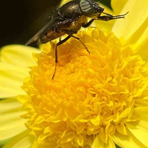 ツマグロキンバエ クロバエ科ツマグロキンバエ亜科 シャスターデージーの上にて。仲良く。