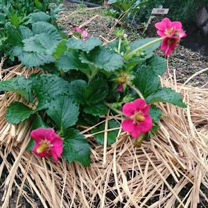赤い花のイチゴちゃん植えました( ´͈ ᵕ `͈ ) 実が食べられるそうなので敷き藁しましたょ♡(๑′ฅฅ‵๑)ムフフ