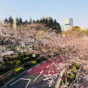 暖かかったので🐶🐾散歩道、赤坂サカスに河津桜🌸が~ 青空にはひこうき雲☁だー
