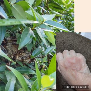 令和6年7月15日(月) 三枚目の投稿観覧注意⚠️ わが家の大切なオージープランツ🌱レモンマートルさん♥️たくさんお花が咲いたけど、知らぬ間に終わっちゃってました😅葉はハーブ🌿になるレモンの爽やかな香りヽ(´▽`)/💓♥️❤️ しかし‼️ヤバイ物を発見してしまいましたヽ(ヽ゚ロ゚)ヒイィィィ!💦 チャドクガの次は、まさかの蜂〰️アシナガバチの巣〰️((( ;゚Д゚)))ガクガクブルブル💦 直ぐ様シャワーで蜂を追い出して、恐る恐る蜂の巣を✂️でチョキン💦 蜂達、しばらくは徘徊していましたがもう大丈夫です💧 まさかレモンマートルさんが、蜂の大好きな木だったなんて〰️ヽ(ヽ゚ロ゚)ヒイィィィ! これからも気を付けて観察しなければ〰️😭 今日は、お天気☀️プールを出して遊ぼうかな🏊♂️ 皆様、良い1日を🌱