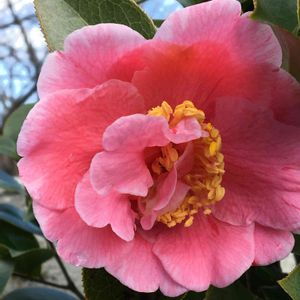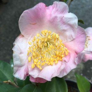 淡いピンクの一重咲き、香り椿 軟風が、咲きました。