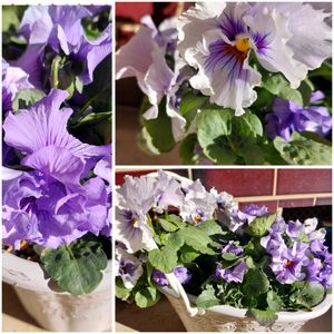 今日のお花 パンジー💜🤍💜 「絵になるスミレパルム」 色違いを、同じ鉢に植えてみたら、白っぽいほうが、成長が早く徒長気味に、なっています😅