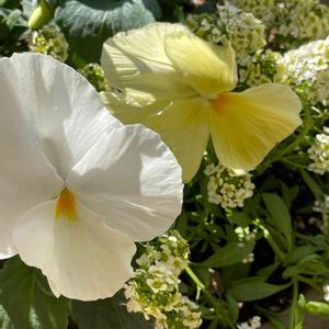 仲良しパンジーさん🤍💛 その隣にクリーム色のアリッサムさん💛 レモンイエロー🍋とかクリーム色とか 優しい色、大好きです💛🌿🤍💛🌿🤍
