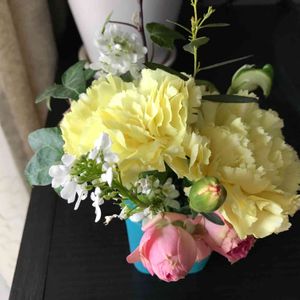 おはようございます☔️ 早くに 雨が降ってきました💦 昨夜 レモンイエローの カーネーションにニゲラを 追加 して再アレンジしました😊