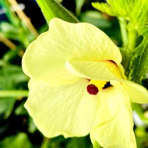 オクラの花🌼パッと咲きました(10時32分) 朝から、だんだん開いてこんなに可愛く💕 レモンイエローのヒラヒラ花びら〜💛🍋 咲く度に、癒される🥰