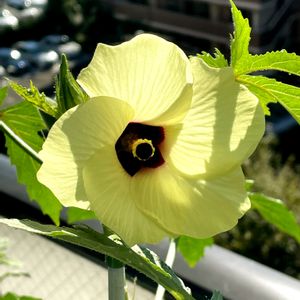 今朝咲いた🌼オクラの花🌼 レモンイエローのオクラのお花🍋 お日様の光で透けた花びら🌼キレイ✨ 今日も快晴☀️夏日のように、暑い💦 🏷日曜ビタミンカラー♪
