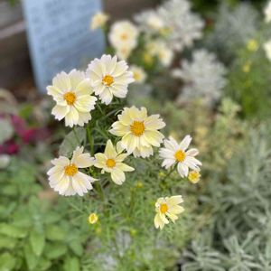 我が家の一年草のコスモスはふんわりレモンイエローのキサントスさんです🍋 少し小さなお顔をしていて少しフレアの入った可愛子ちゃん☺️ 周りの植栽から一段高く飛び出して お顔を揺らします