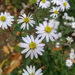 いつもの散策路でこのコも少なくなっています。😞 緑色をおびたような白い花のこの小菊が好きです💘 静岡県の秋葉山の由来です。千葉県の清澄山からの由来でキヨスミギクとも呼ばれているようです。 ⑤葉柄があるのが特徴です。 キク科 シオン属 花期 9〜11月 分布 関東〜中部