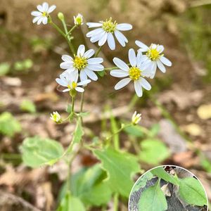 背が低く花も控えめな野菊に出会いました。 広卵形の葉、長い柄には翼が細く付いています。 アキハギクでしょうか? キヨスミギクも近い種類のようですが、葉柄が短く毛が目立つようです🤔