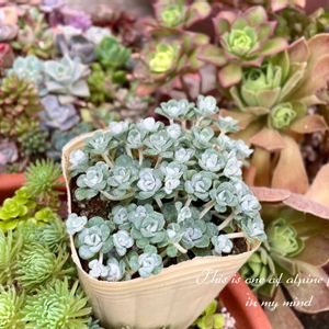 昨日、爪蓮華をお分けしたご近所さんからいただきました。 セダム属ケープブランコ。 (白雪ミセバヤという別名もありますね) 自分の中で、この子はセダムでもミセバヤでもなく 非耐暑性「高山植物」です⛰ わざわざ買ってきてくださったのに 夏越しを成功させる自信が全くありません😱 夏越し経験者の方からアドバイスをいただけたら嬉しいです🙏