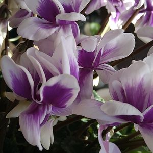 おはようございます😊 ① 出先の素敵な色会いのシクラメン💜💮 サファイア😍 ② ぷくぷくが可愛い多肉ちやん💓❣️ ③ 植えたばかりで勢揃いのハボタンさん🤍🌱 ④ ろまんちっく村エントランスホール🍃 ⑤ 施設のクリスマスツリー🎄