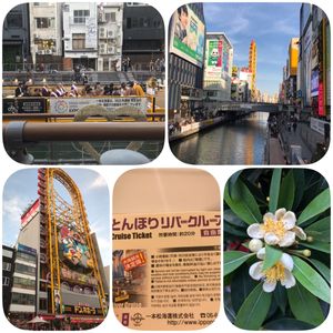 大阪旅行② 道頓堀川クルーズも体験🚢 左下はドンキホーテの大観覧車 エビスタワー‼️ 高いところは苦手なので乗りませんが😅 そして右下は散策中に可愛いお花発見🌸 名前は分かりません🤔