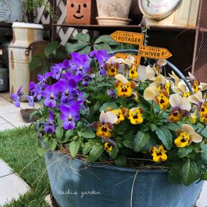 【ビオラ】 『ファーマーズクラフト』 〜農家が裏庭でこっそり育てる秘密のビオラ〜 先日の園芸店で 素敵な子に出逢えました🥰 この品種は一期一会✨ みんなお顔が違くてワクワクしながらお気に入りを探します。 お高いブランド苗にそっくりな子もいたり…😁 出廻る時期が早いしお値段も優しめ♡ この子もあの子に似ています🤭ウフ