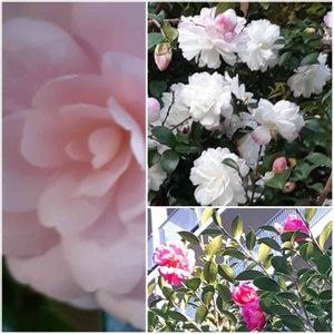朝散歩 私の大好きな乙女椿 咲き始めました。 右は白山茶花と赤山茶花 白は満開咲き誇ってます。