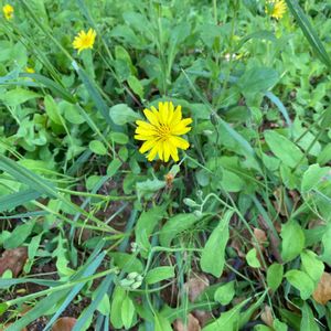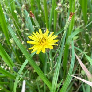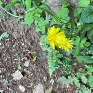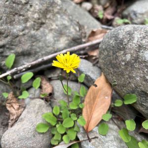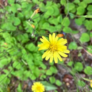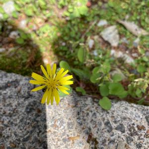 花壇の芝桜の隙間から生えてきました。 花はタンポポに似ている感じですが、タンポポよりも花びらが少ないです。茎は細く、葉も小さいです。 とても可愛らしくて名前が知りたいです。