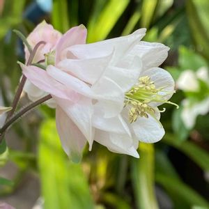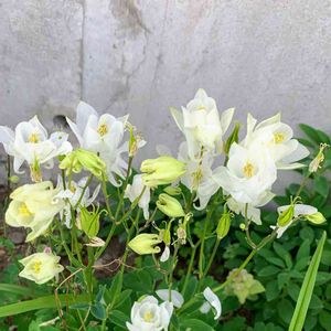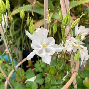 白のセイヨウオダマキを見つけました😊 お宅の外に無造作に置かれたポットの中、清楚なお顔で密やかに😊