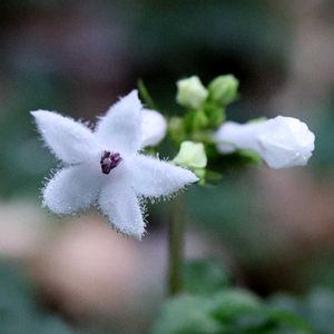 【サツマイナモリ(薩摩稲森)】 日本原産、アカネ科 多年草 関東以西~沖縄の山地の林床のやや湿った場所に生育する。 地面に這って広がる。 花は茎頂に巻散状の集散花序をつくり、白色で、長さ1.5㎝ほどの漏斗状。先が5裂する。花びらに細かい毛が密生している。 草丈:10~20cm 開花時期:12~5月 花色:白 長門峡@山口市・萩市