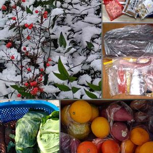 ホワイトクリスマス⛄️🎄❄️ 白い雪の中に南天の赤い実が少し 小鳥さんがお食事したらしいです🐦️ 我が家に、サンタさんが訪れました✨🎁✨ 九州の叔母から冬の味覚柑橘類 新潟から魚介類 東京のKちゃんからお菓子類 お隣さんから新鮮野菜 素敵なサンタさん達に感謝・感謝・感謝です🎶