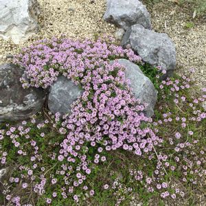 タイム ロンギカウリス (T. longicaulis) 🌸 薔薇の花がら摘みの時 大活躍してくれます😃 高枝切りバサミで切った薔薇は このお花のベットの上に下ろします🌹 摘み取り終わってから 籠に入れて運びました🌹🌹🌹 薔薇の花びらが痛まないので とてもありがたかったです😃😃😃